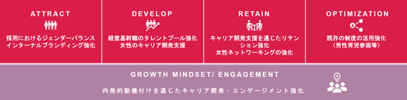 人材の多様性には、人種、国籍、性別、年齢等いろいろな視点があり、国や地域の状況によって課題はさまざまです。日本では性別による多様性が十分ではないと認識し、「女性の活躍」を推進することを出発点に活動を開始しました。2007年度に社長直轄プロジェクトとしてWIND(Women's Innovative Network for Diversity)プロジェクトを発足し、職場・上司・女性の意識や行動の変革を促進していく「チェンジ・マネジメント」と、業務プロセスや人事制度の仕組み・運用などの「枠組み改革」の両方を同時に推進してきました。全てのポジション・グレードにおいて、アステラスで働く全ての社員がいきいきとやりがいをもって働き、ジェンダーに関わらず活躍している状態を目指し、多様な人材の能力発揮につなげるための課題を解決していくことが、アステラス全体の競争力強化につながると考え、今後も取り組みを推進していきます。